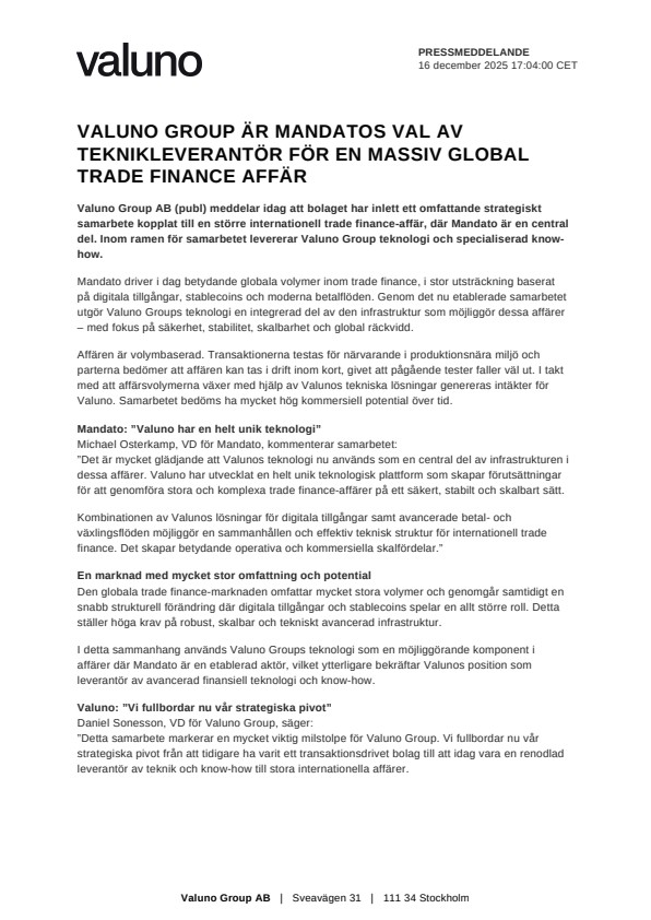 Mandato driver i dag betydande globala volymer inom trade finance, i stor utsträckning baserat på digitala tillgångar, stablecoins och moderna betalflöden. Genom det nu etablerade samarbetet utgör Valuno Groups teknologi en integrerad del av den infrastruktur som möjliggör dessa affärer – med fokus på säkerhet, stabilitet, skalbarhet och global räckvidd.