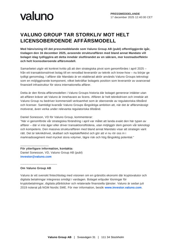 Med hänvisning till det pressmeddelande som Valuno Group AB (publ) offentliggjorde igår, tisdagen den 16 december 2025, avseende strukturaffären med bland annat Mandato vill bolaget idag tydliggöra att detta innebär slutförandet av en säkrare, mer kostnadseffektiv och helt licensoberoende affärsmodell.
